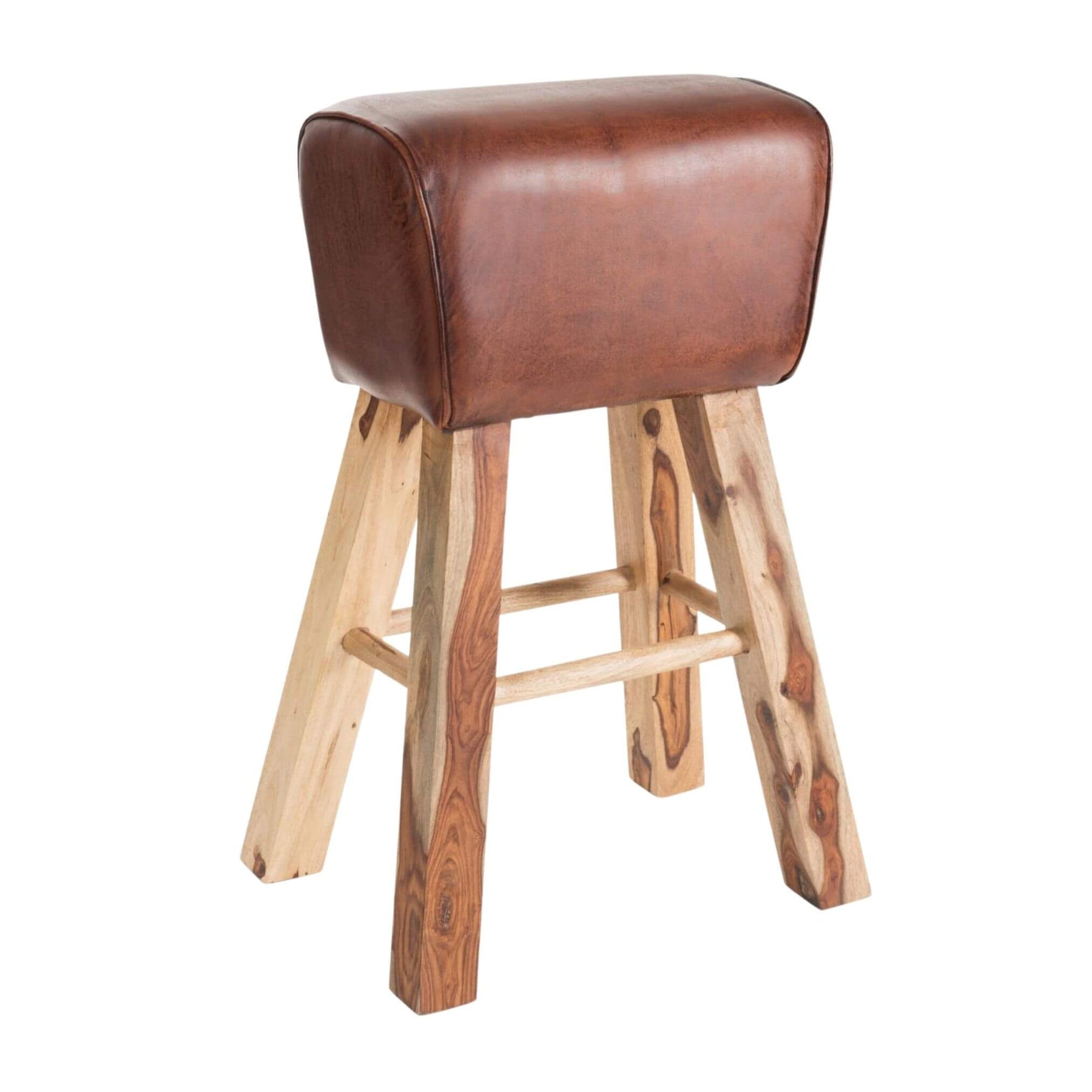 The Rock Bar Stool brings a warm, rustic touch to any bar or kitchen counter. Featuring a padded brown leather seat and sturdy wooden legs, its unique block-like shape offers both comfort and a bold visual presence. Perfect for homes or hospitality spaces seeking a mix of durability and style.