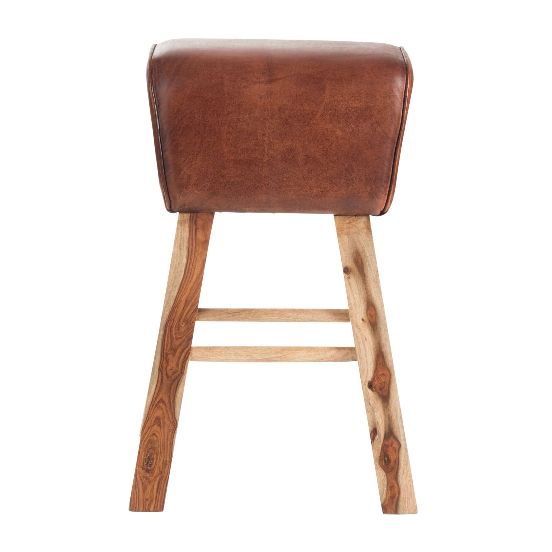 Rock Bar Stool with brown leather seat and wooden legs front view