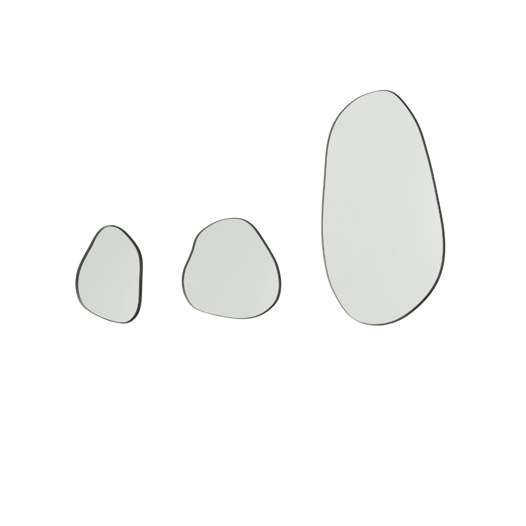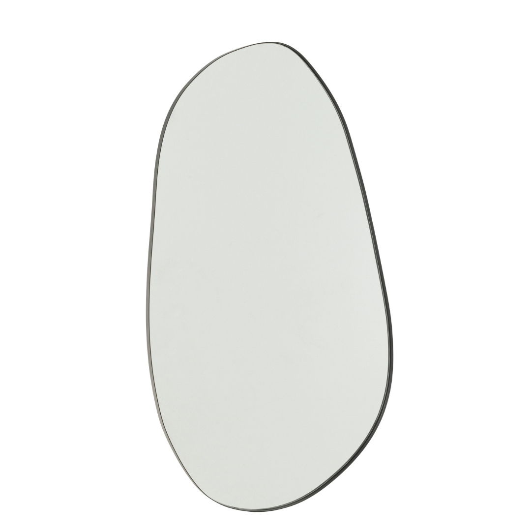 The Utara Iron Mirror blends the strength of industrial design with the softness of organic shapes. Featuring a sleek iron frame in fluid, pebble-like contours, this mirror brings modern sophistication and a touch of artistry to any space. Perfect for entryways, living rooms, or bedrooms, it can be displayed individually or as a striking set for a dynamic wall composition.