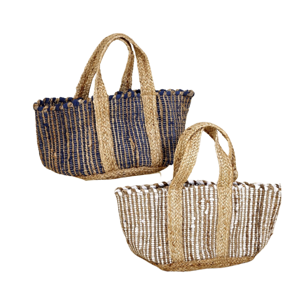 The Varanasi Jute Basket is a handwoven carryall with a unique vertical weave design, available in natural and indigo tones. Perfect as a market tote, storage basket, or beach bag, it combines rustic texture with versatile functionality.